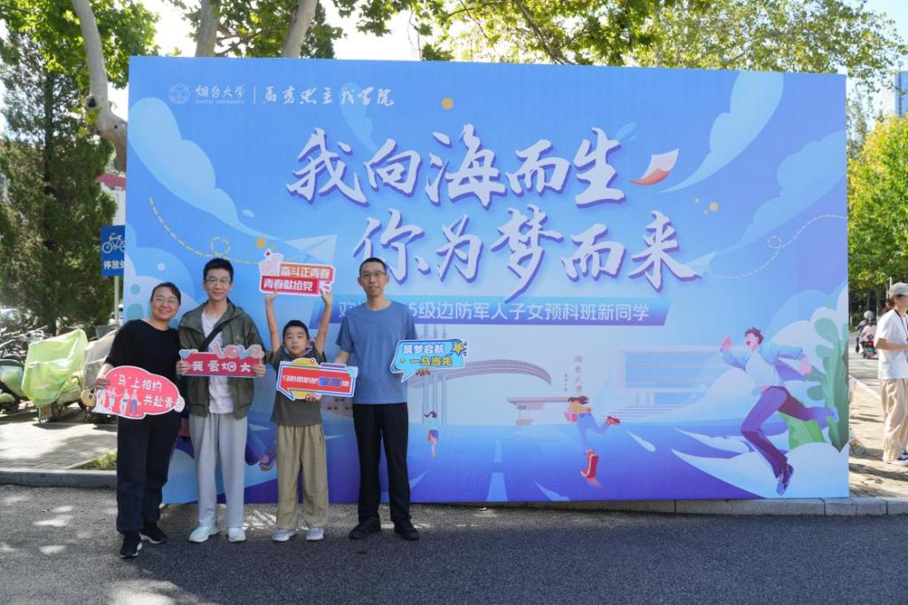 “你向海而生,我为梦而来”展板前,预科班新生们面带笑容,与家人留下了珍贵的合影。