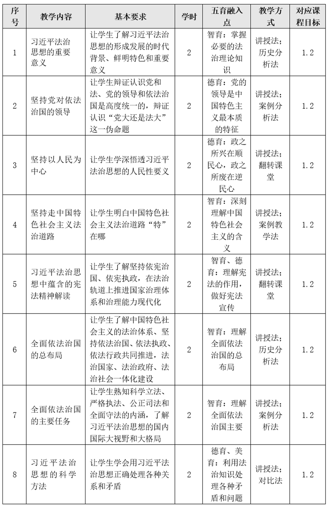课程目标1:通过教学,让学生掌握习近平法治思想的重要意义、核心要义和科学方法,了解我国全面依法治国的基本方略,对法治建设进程中的出现的问题有一个客观理性的认识和思考。
