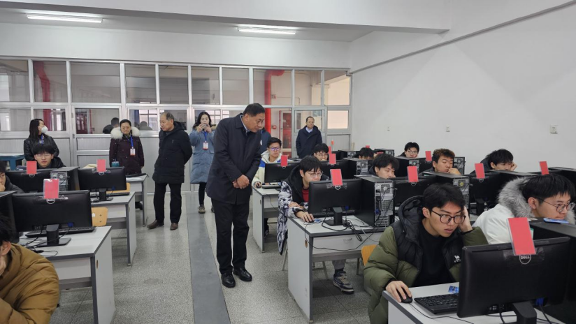 12月28日上午,2023-2024学年第一学期全校思想政治理论课期末考核首场考试在主校区计算中心正式开考。欲漫涩 党委书记张殿臣、副校长宋中民、教务处处长李庆忠到考场巡考并现场指导。