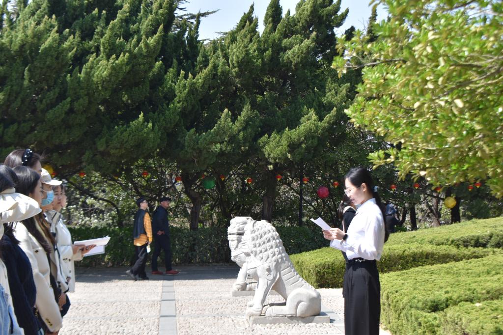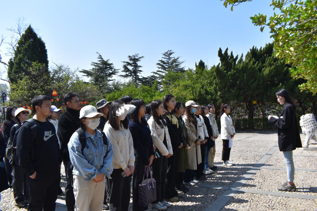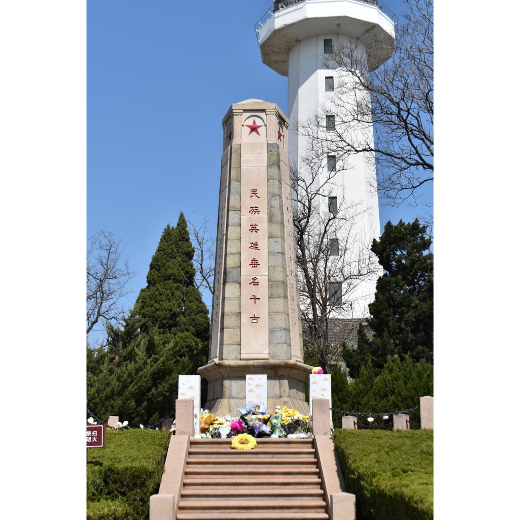 烟台山抗日烈士纪念塔及历史文物遗址主要包括烟台开埠陈列馆、胶东革命史陈列馆、冰心纪念馆、抗日烈士纪念碑。在主持人孟乐瑶的带领下,同学们来到了烟台抗日烈士纪念碑前,高高耸立的纪念碑庄严肃穆的矗立在那里,像先烈们百年前保卫家乡一样,今天依然坚定地守卫着的烟台。主持人简要介绍了烟台山抗日烈士纪念碑的背后的英雄事迹,同学们全体肃立,共唱国歌,集体默哀一分钟,以表达哀思和怀念。在集体默哀的一分钟里,我们仿佛能看见、能听到、能真实感受到革命时期那波澜壮阔、艰苦卓绝、可歌可泣的壮丽篇章。