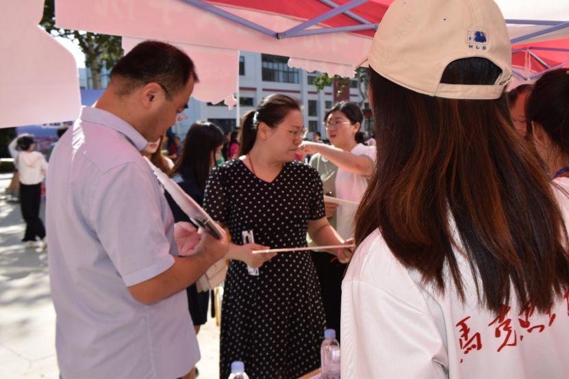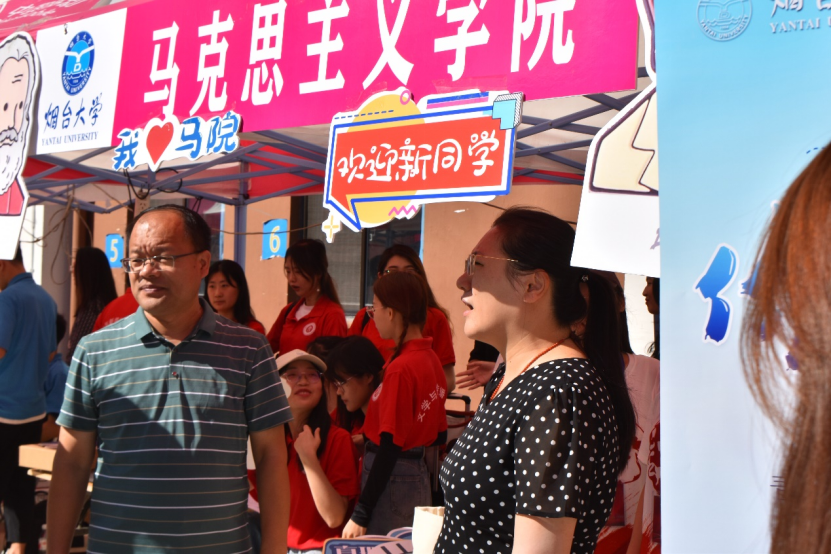 党政领导、研究生秘书、辅导员在迎新现场,与新生亲切交流,询问报到情况。