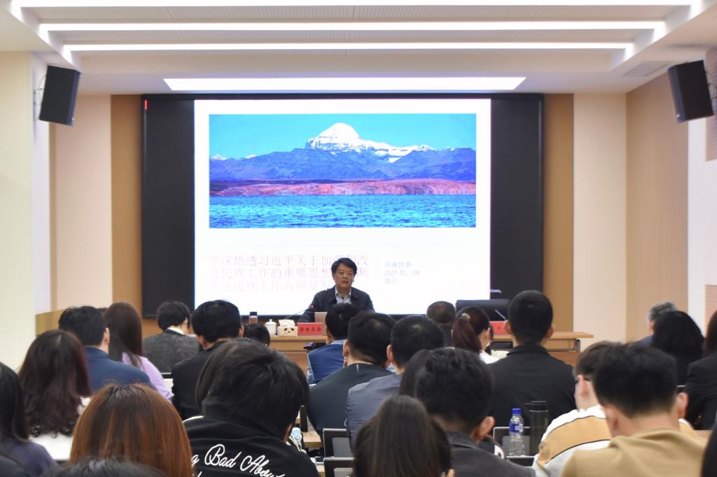 丹珠昂奔以《学深悟透习近平总书记关于加强和改进民族工作的重要思想,不断推进民族工作高质量发展》为题,从“深刻认识学深悟透习近平关于加强和改进民族工作重要思想的三个关键点”“了解民族工作阶段性特征”“完整准确、全面把握习近平总书记关于加强和改进民族工作的重要思想的核心要义”“学深悟透习近平总书记讲到的几个辩证关系”“推进民族工作高质量发展”等五个方面进行阐释和论述。讲座主题鲜明、立意深刻、逻辑性和思想性很强,对深入学习领会习近平总书记关于加强和改进民族工作的重要思想、贯彻落实中央民族工作会议精神、加强和改进欲漫涩