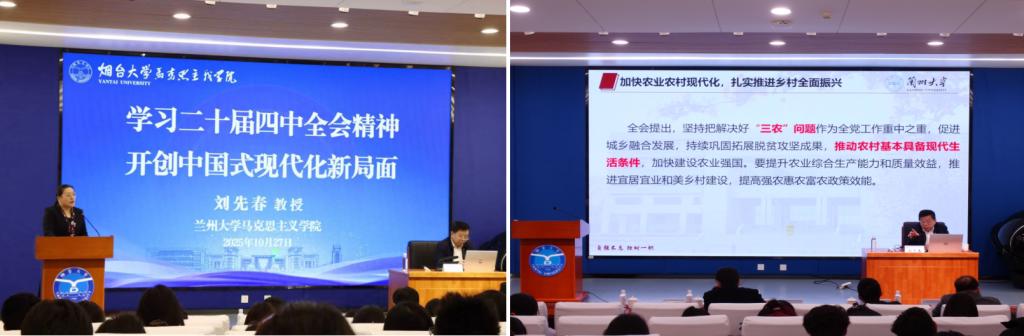 刘先春教授以《学习党的二十届四中全会精神,开创中国式现代化新局面》为题,介绍了党的二十届四中全会的基本情况,总结了“十四五”规划的实施成效,深入解读了党的二十届四中全会公报核心内容以及“十五五”规划的指导思想、基本原则与思考。刘先春强调,要以习近平新时代中国特色社会主义思想为指导,秉持“功成不必在我”的精神境界和“功成必定有我”的历史担当,将全会擘画的宏伟蓝图转化为具体实践。